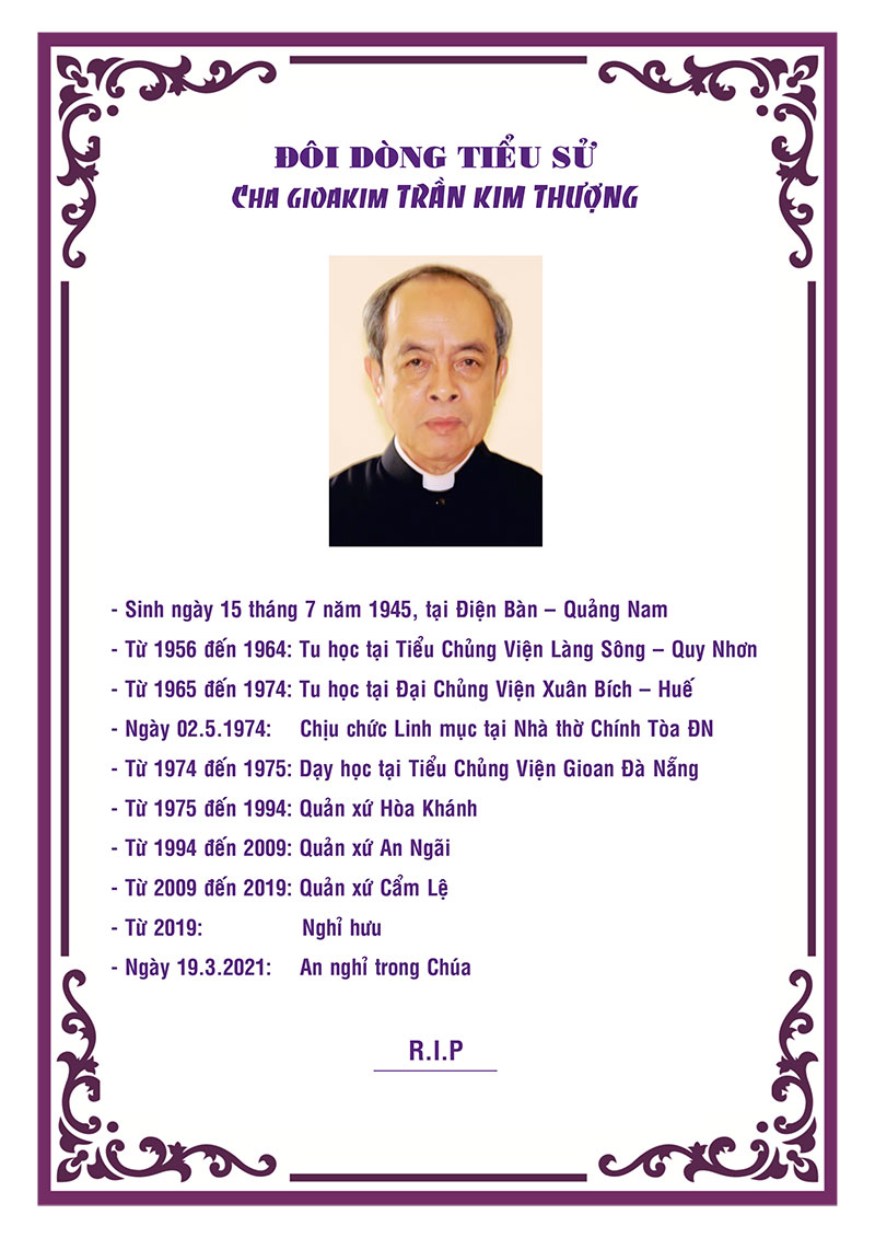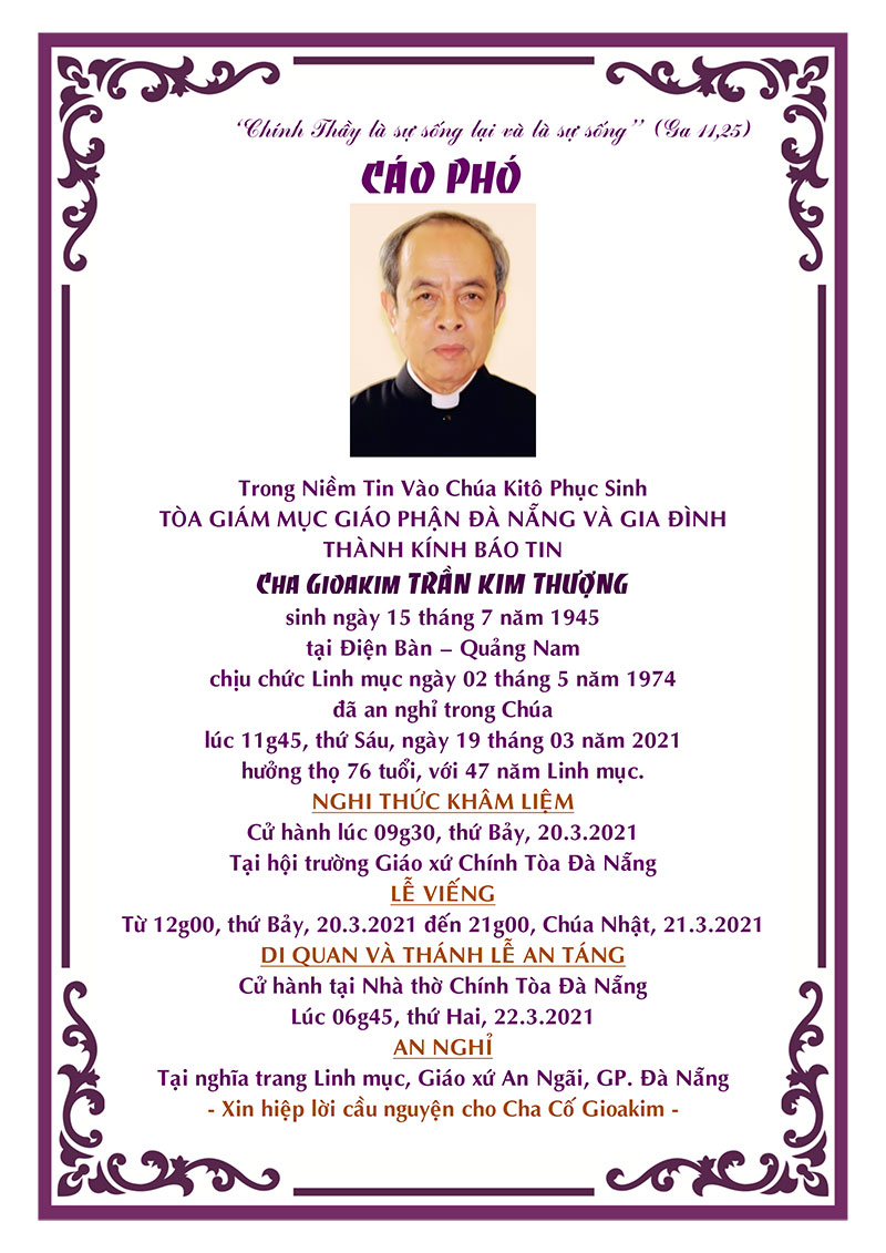 Được tin Linh mục Trần Kim Thượng, Thánh Danh Giô-a-kim, thuộc Giáo Phận Đà Nẵng, mới qua đời tại Đà Nẵng, Mục Vụ Văn Bút cho đăng lại tin Cáo Phó, Chương trình Tang Lễ và mấy dòng tiểu sử, do Văn Phòng Toà Giám Mục và tang quyến sắp xếp, để độc giả cùng thông hiệp trong lời nguyện cầu cho linh hồn Cha Giô-a-kim.