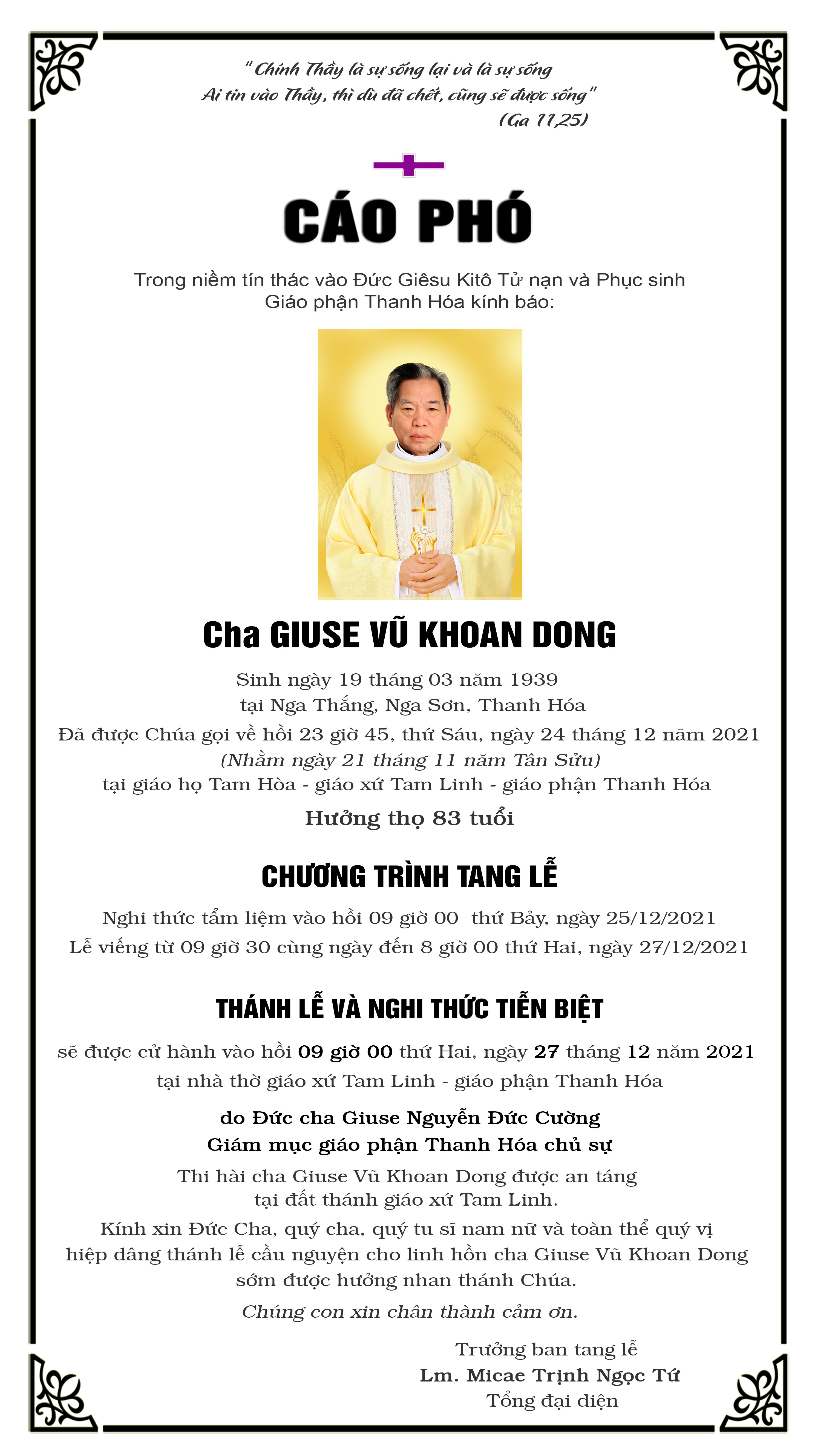 Được tin Linh mục Vũ Khoan Dong, Thánh danh Giu-se, thuộc Giáo Phận Thanh Hoá, mới qua đời, Mục Vụ Văn Bút cho đăng lại tin Cáo Phó này, để độc giả cùng thông hiệp trong lời nguyện cầu cho linh hồn Cha Giu-se được hưởng ơn nghĩa trong Nước Chúa.