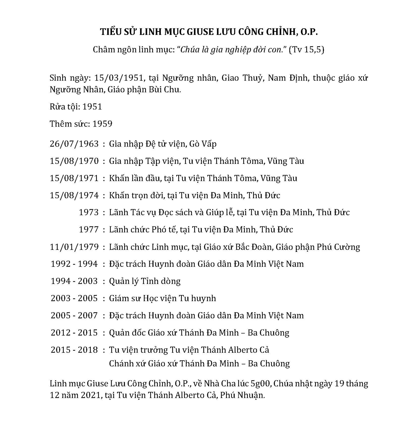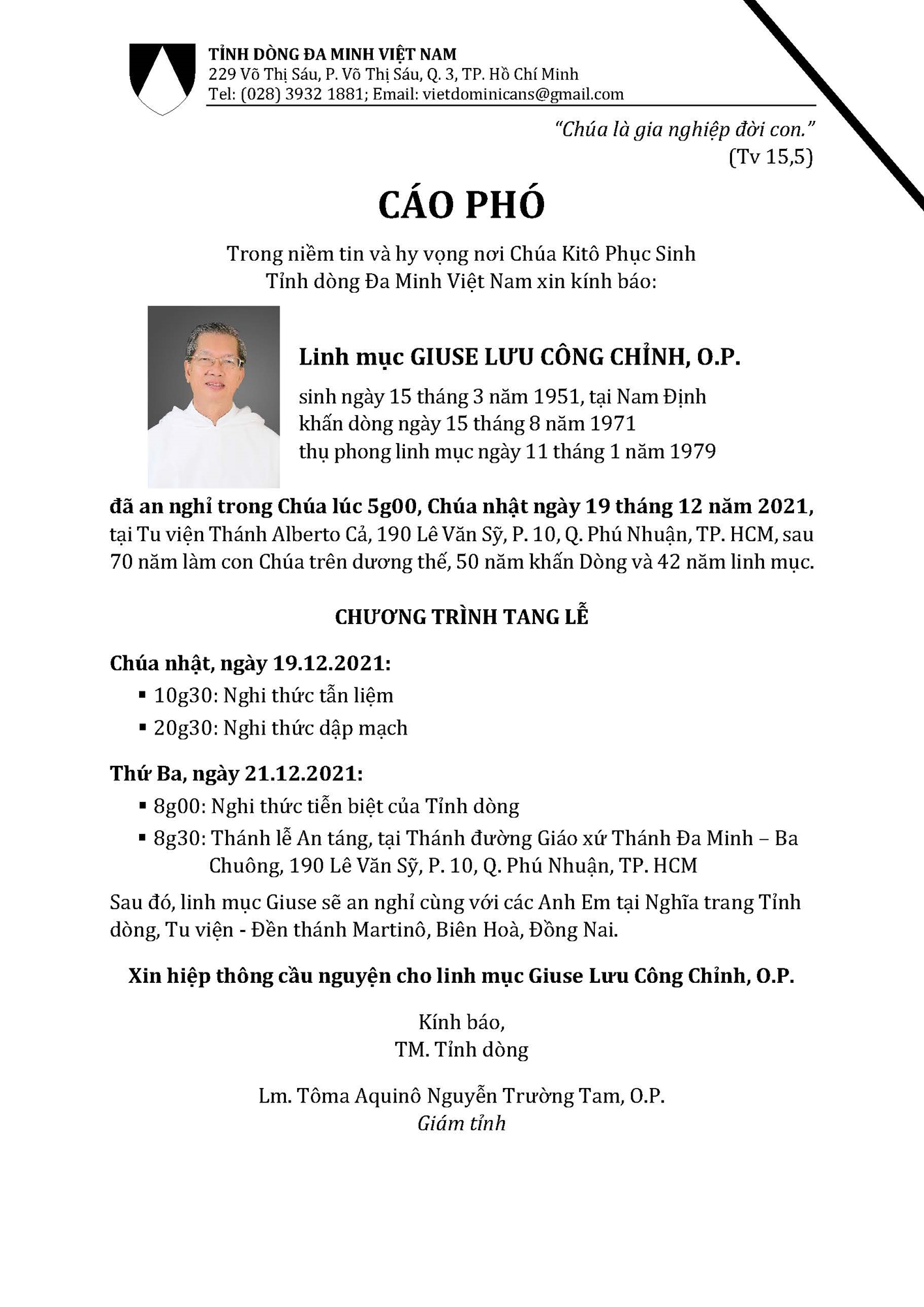Được tin trễ Linh mục Lưu Công Chính, Thánh danh Giu-se, Dòng Đa Minh, mới qua đời, Mục Vụ Văn Bút cho đăng lại tin Cáo Phó, Chương trình tang lễ và mấy dòng tiểu sử, để độc giả cùng thông hiệp trong lời nguyện cầu cho linh hồn Cha Giu-se  được hưởng ơn nghĩa trong Nước Chúa.