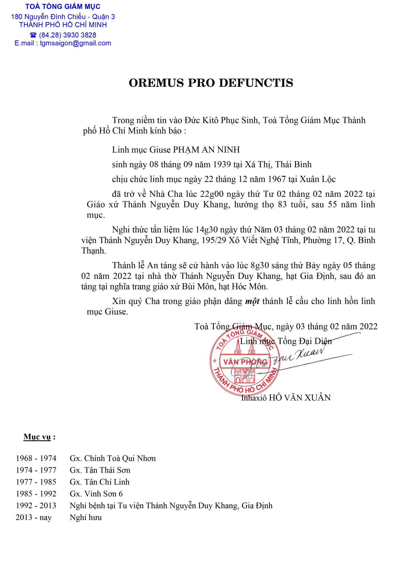 Trong tinh thần hiệp thông, Mục Vụ Văn Bút cho đăng lại tin Cáo Phó Linh Mục Phạm An Ninh, Thánh Danh Giu-se, Chương trình tang lễ và mấy dòng tiểu sử, do Lm I-Nha-xiô Hồ Văn Xuân, sắp xếp, để độc giả cùng thông hiệp trong lời nguyện cầu cho linh hồn Cha Giu-se được hưởng ơn nghĩa trong Nước Chúa.