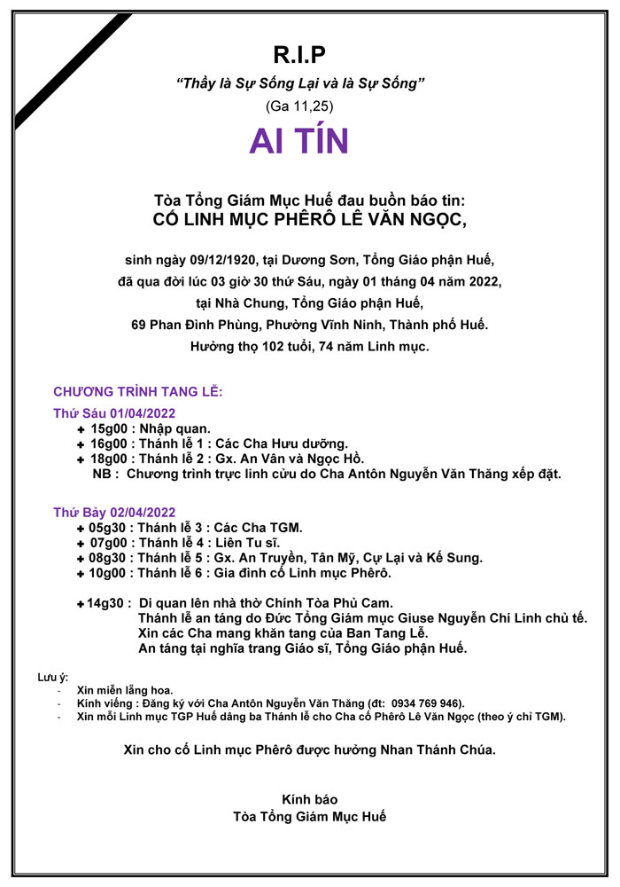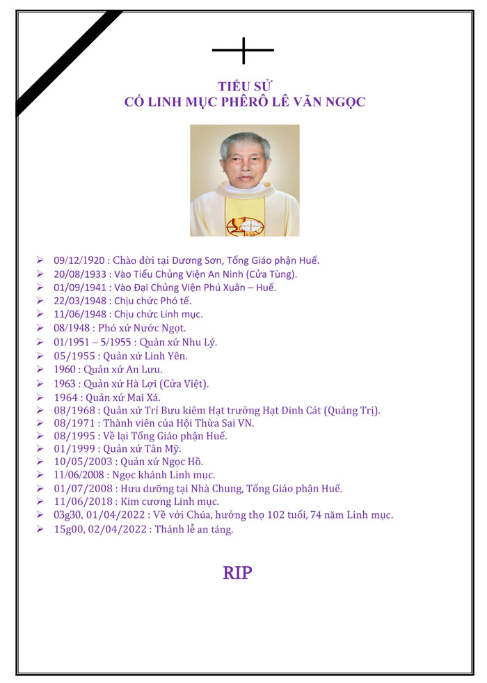 Được tin Linh mục Lê Văn Ngọc, Thánh danh Phêrô, thuộc Giáo Phận Bà Rịa mới qua đời, Mục Vụ Văn Bút cho đăng lại tin Cáo Phó, Chương trình tang lễ và mấy dòng tiểu sử, do Toà Giám Mục sắp xếp, để độc giả cùng thông hiệp trong lời nguyện cầu cho linh hồn Cha Phêrô được hưởng ơn nghĩa trong Nước Chúa.