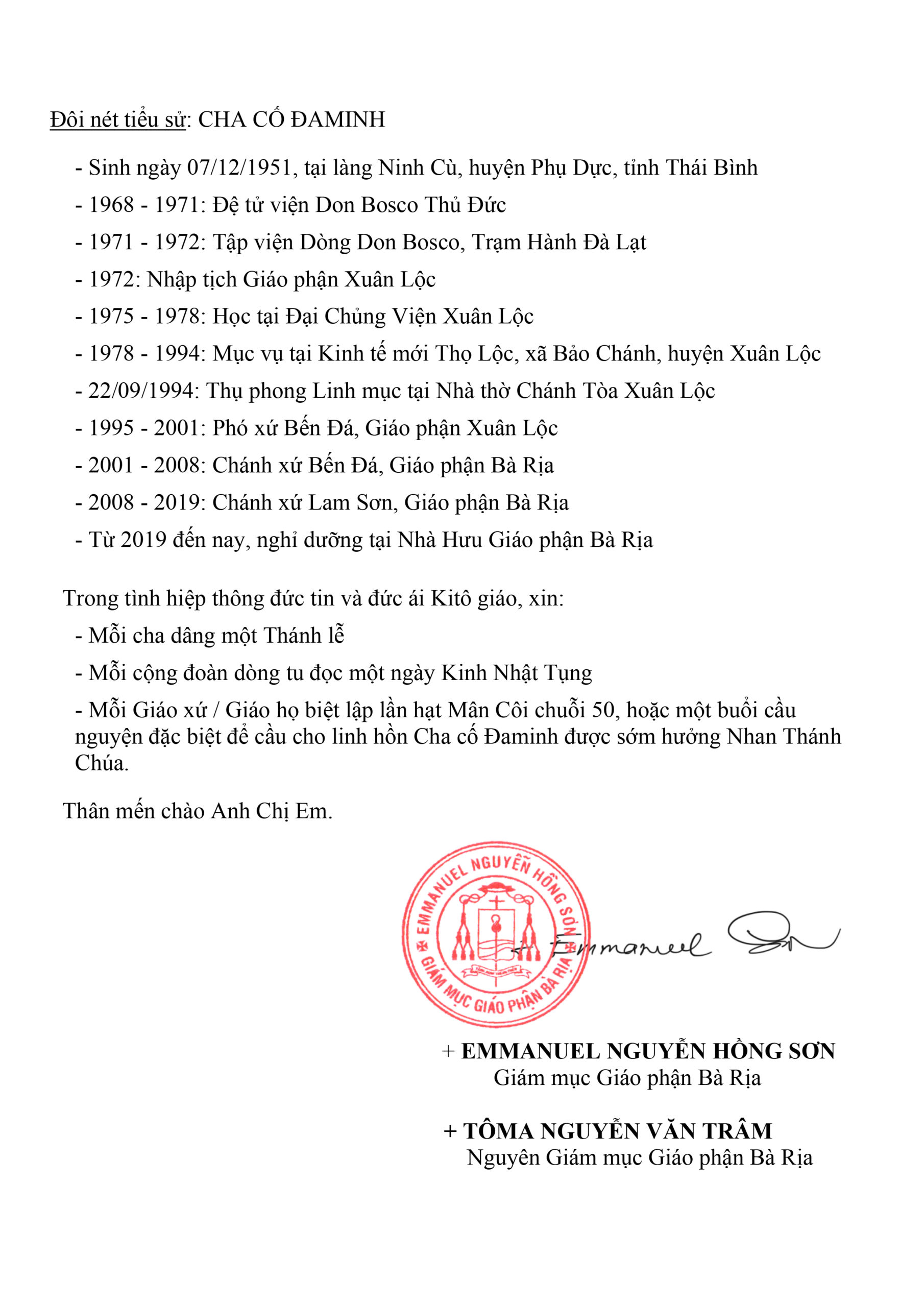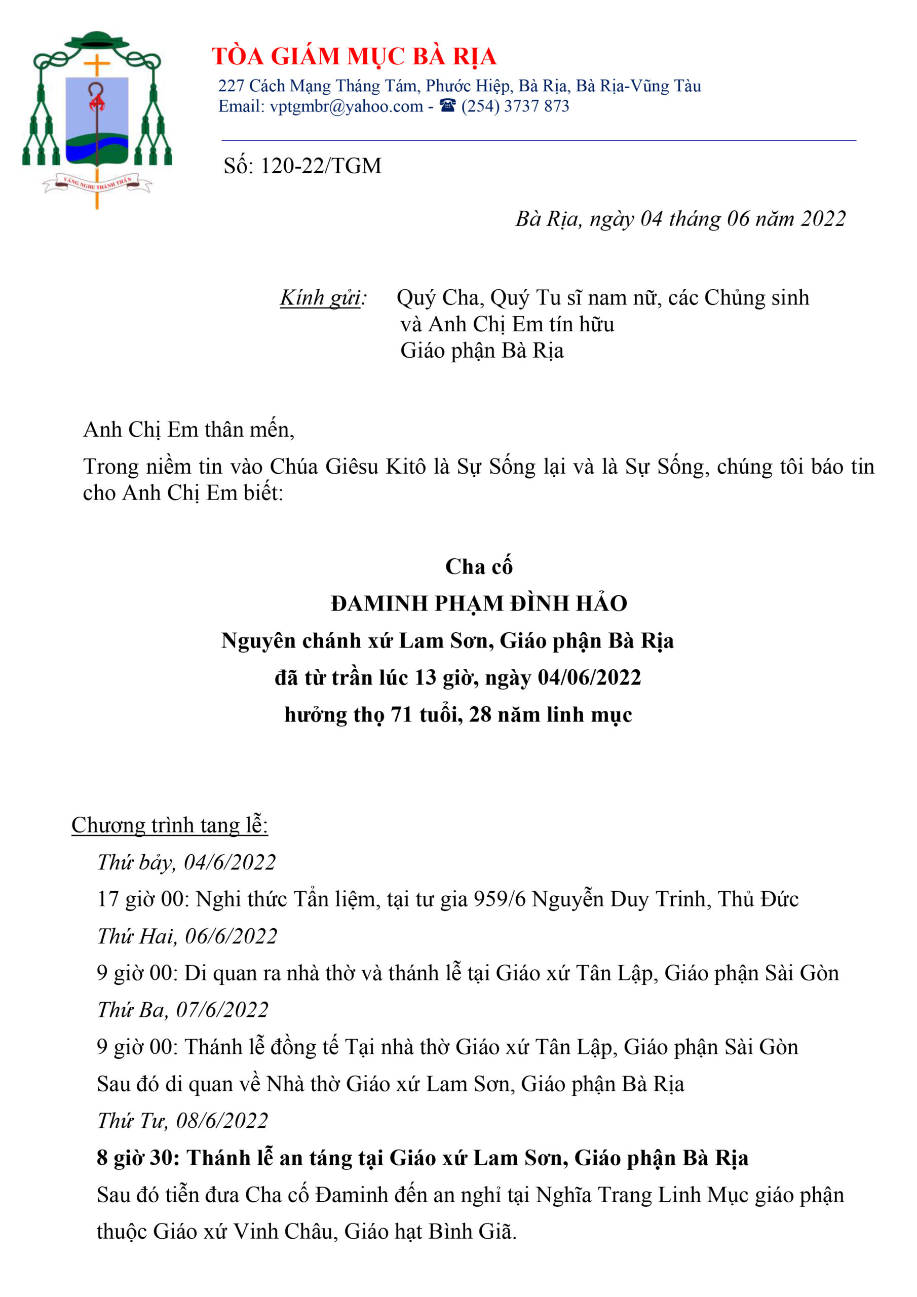 Hiệp thông trong tâm tình phân ưu và nguyện cầu cho linh hồn Cha  Phạm Đình Hảo, Thánh Danh Đa Minh, Mục Vụ Văn Bút cho đăng lại Thư Báo Tử, Chương trình tang lễ và mấy dòng tiểu sử của linh mục quá cố do Văn Phòng Toà Giám Mục Bà Rịa sắp xếp, với lời nguyện cầu cho Linh Hồn Cha Đa Minh  được hưởng ơn nghĩa trong Nước Chúa.