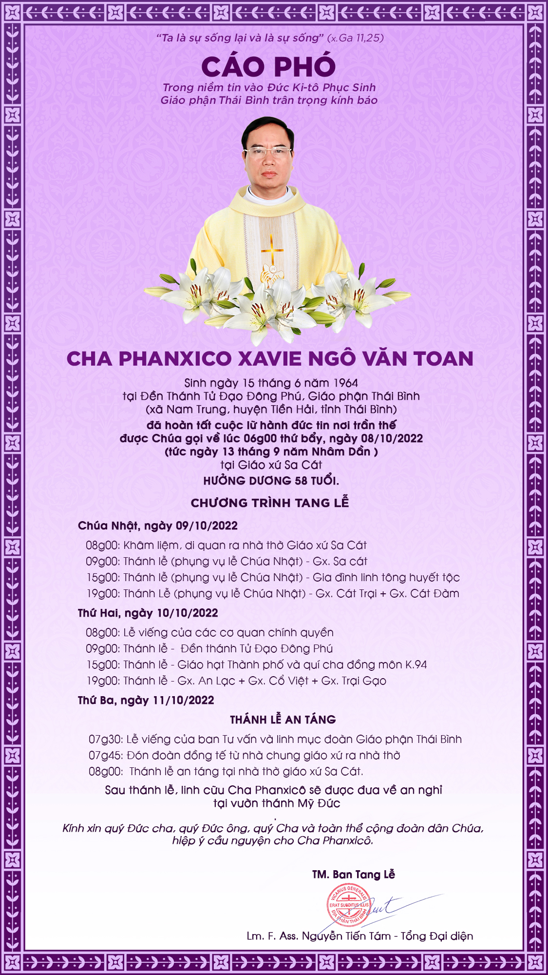 Được tin Linh mục Ngô Văn Toan, Thánh danh Phan-xi-cô Xaviê, thuộc Giáo Phận Thái Bình,  mới qua đời tại Sa Cát, Mục Vụ Văn Bút cho đăng lại tin Cáo Phó, Chương trình tang lễ, do Văn Phòng Giáo Phận sắp xếp, để độc giả cùng thông hiệp trong lời nguyện cầu cho linh hồn Cha Phanxicô Xaviê được hưởng ơn nghĩa trong Nước Chúa.
