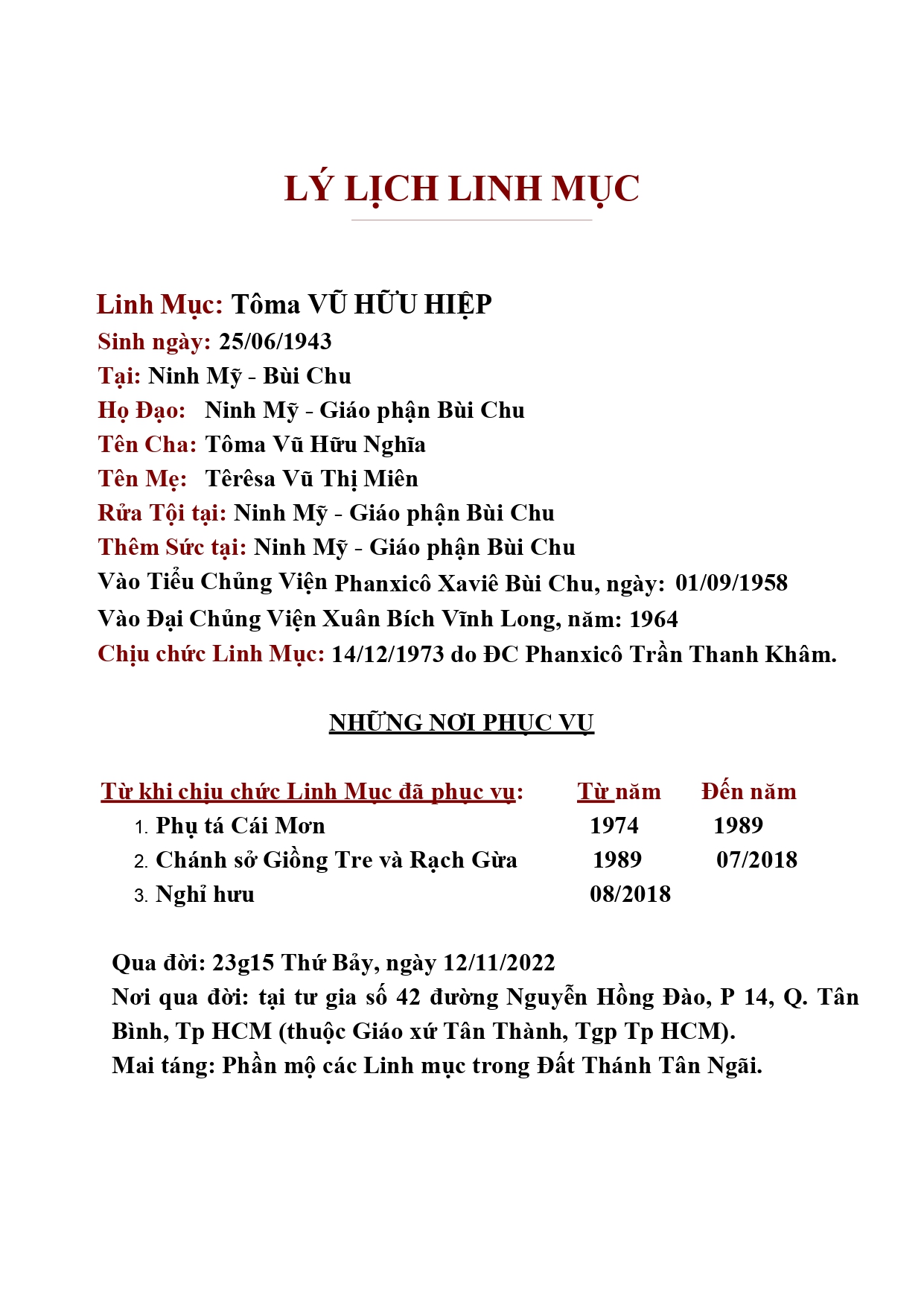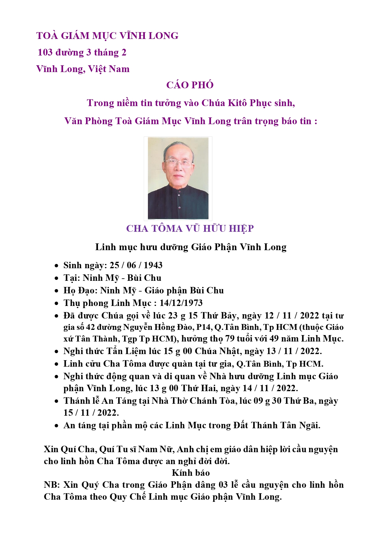 Được tin Linh mục Vũ Hữu Hiệp, Thánh danh Tôma, mới qua đời, Mục Vụ Văn Bút cho đăng lại tin Cáo Phó, Chương trình tang lễ và mấy dòng tiểu sử do Văn Phòng Giáo Phận Vĩnh Long sắp xếp, để độc giả cùng thông hiệp trong lời nguyện cầu cho linh hồn Cha Tôma được hưởng ơn nghĩa trong Nước Chúa.