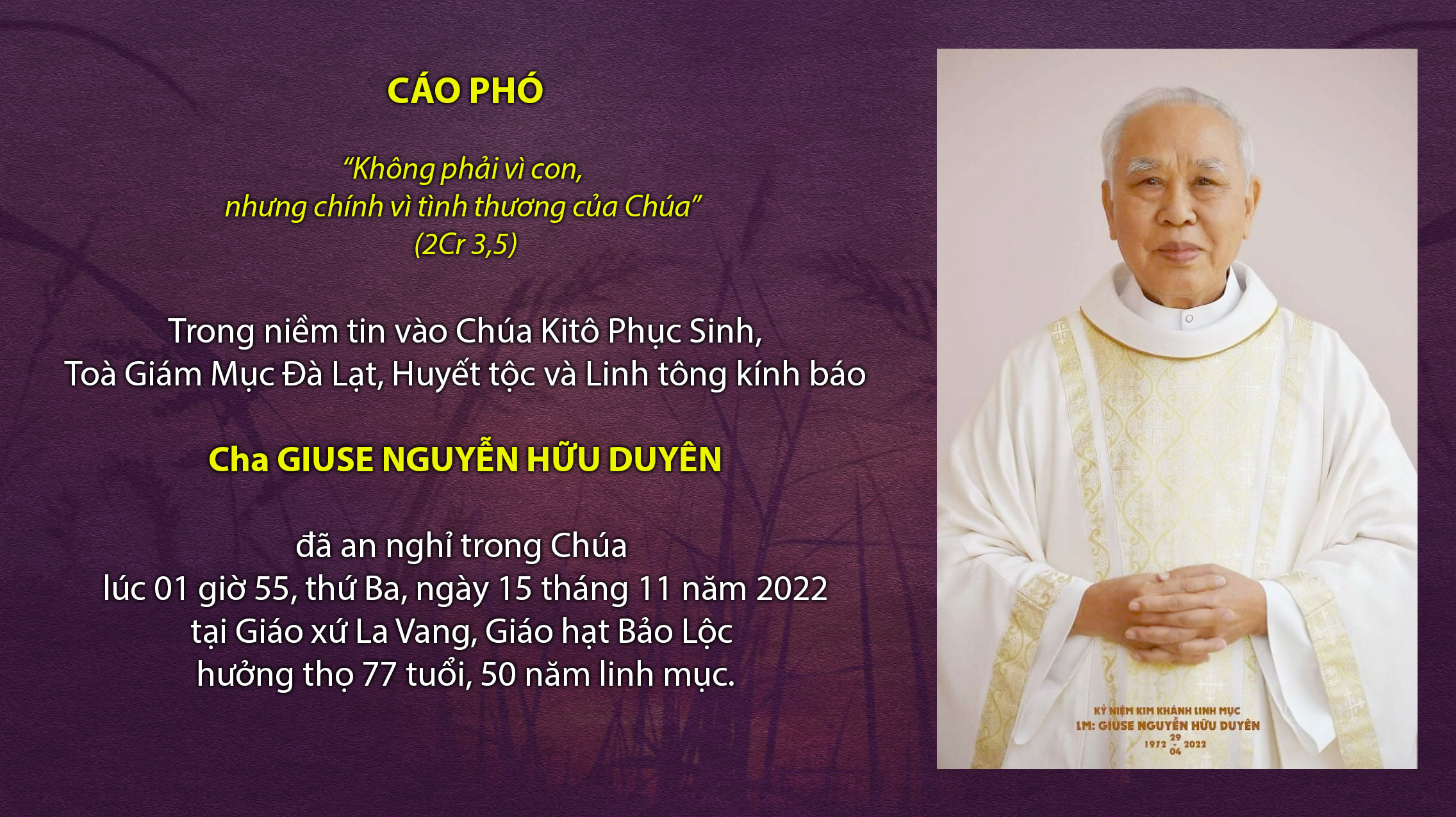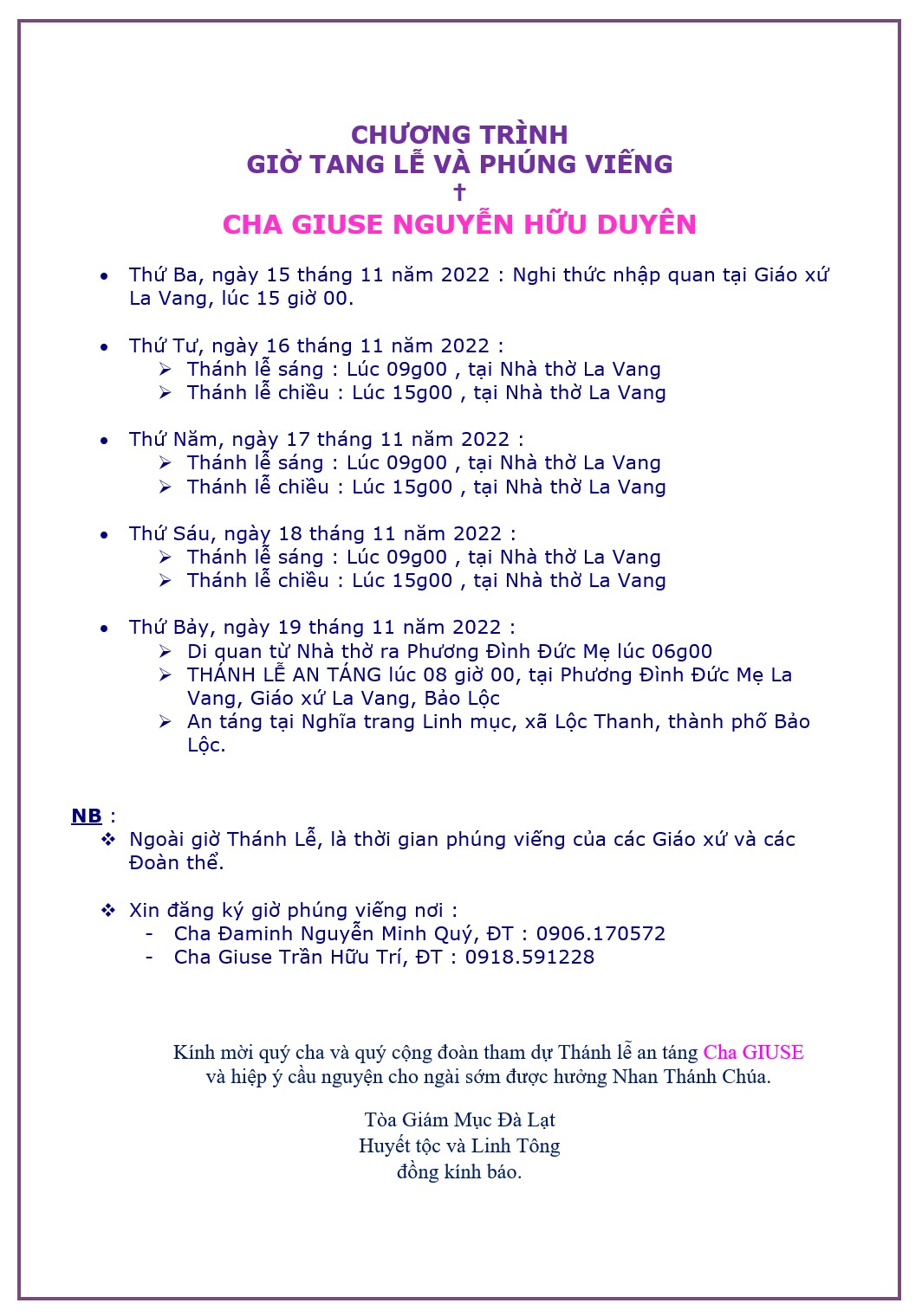 Trong niềm hiệp thông, phân ưu và cầu nguyện, Mục Vụ Văn Bút cho đăng lại Chương trình tang lễ của Linh Mục Nguyễn Hữu Duyên, Thánh danh Giu-se thuộc Giáo Phận Đà Lạt do Toà Giám Mục sắp xếp, để độc giả hiệp thông trong lời nguyện cầu cho linh hồn Cha Giu-se được hưởng ơn nghĩa trong Nước Chúa hằng sống.