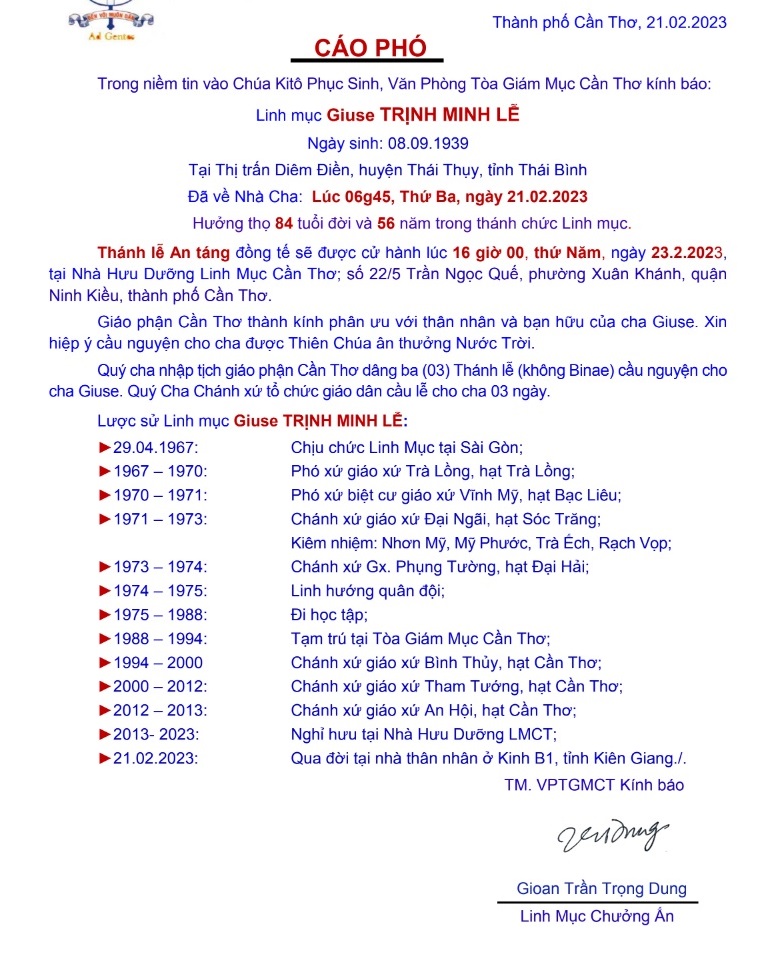 Trong niềm hiệp thông, phân ưu và cầu nguyện, Mục Vụ Văn Bút cho đăng lại Cáo Phó, Chương trình Tang lễ và mấy dòng tiểu sử của Cố Linh Mục, Thánh danh Giu-se, do Văn Phòng Toà Giám mục Cần Thơ sắp xếp để độc giả hiệp thông trong lời nguyện cầu cho linh hồn Cha Giu-se được hưởng ơn nghĩa trong Nước Chúa hằng sống.