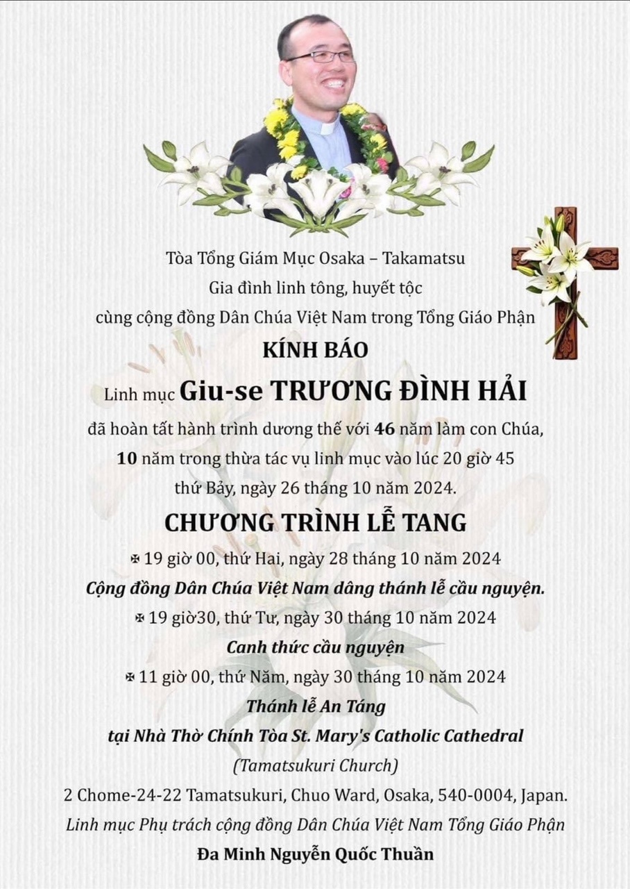 Trong niềm hiệp thông phân ưu và nguyện cầu, Mục Vụ Văn Bút cho đăng lại Cáo Phó, Chương trình Tang lễ của Cha Cố Trương Đình Hải, Thánh danh Giu-se, do Văn Phòng Toà Tổng Giám Mục Osaka sắp xếp, để độc giả cùng thông hiệp trong lời nguyện cầu cho Linh Hồn Cha Giu-se  được hưởng ơn nghĩa trong Nước Chúa.