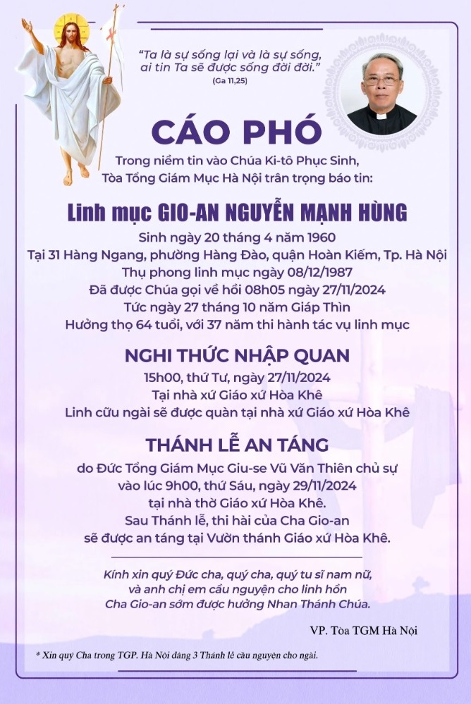 Trong niềm hiệp thông phân ưu và nguyện cầu, Mục Vụ Văn Bút cho đăng lại Cáo Phó, Chương trình Tang lễ và mấy dòng tiểu sử của Cố Linh mục Nguyễn Mạnh Hùng, Thánh danh Gioan, do Văn Phòng Toà Tổng Giám mục Hà Nội sắp xếp, để độc giả cùng thông hiệp trong lời nguyện cầu cho Linh Hồn Cha Gio-an được hưởng ơn nghĩa trong Nước Chúa.