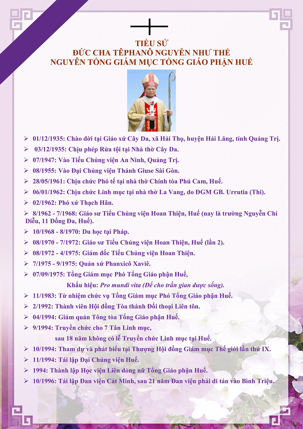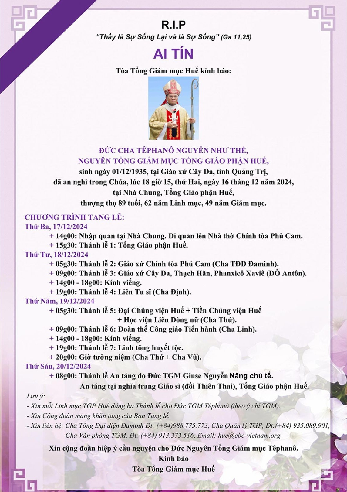 Trong tinh thần hiệp thông, Mục Vụ Văn Bút cho đăng lại Cáo Phó của Đức Cha Nguyễn Như Thể, Nguyên Tổng Giám Mục Huế, Thánh Danh Têphanô, Chương trình tang lễ và mấy dòng tiểu sử, do Toà Tổng Giám Mục Huế sắp xếp, để độc giả cùng thông hiệp trong lời nguyện cầu cho linh hồn đức Cha Têphanô được hưởng ơn nghĩa trong Nước Chúa.