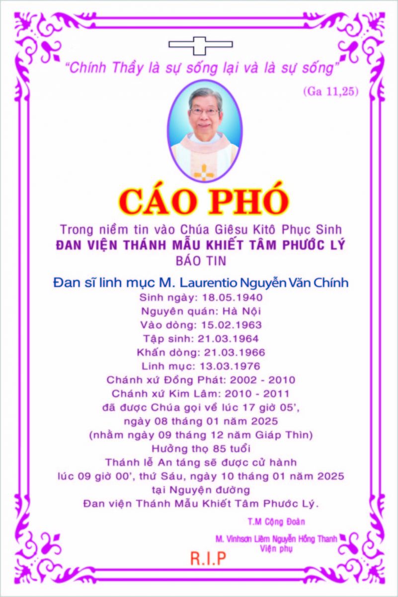 Trong niềm hiệp thông phân ưu và nguyện cầu, Mục Vụ Văn Bút cho đăng lại Cáo Phó, Chương trình Tang lễ và mấy dòng tiểu sử của Cố Đan Sĩ Linh mục Nguyễn Văn Chính, Thánh danh M. Laurentiô, do Văn Phòng Viện Phụ sắp xếp để độc giả cùng thông hiệp trong lời nguyện cầu cho Linh Hồn Cha Laurentiô được hưởng ơn nghĩa trong Nước Chúa.
