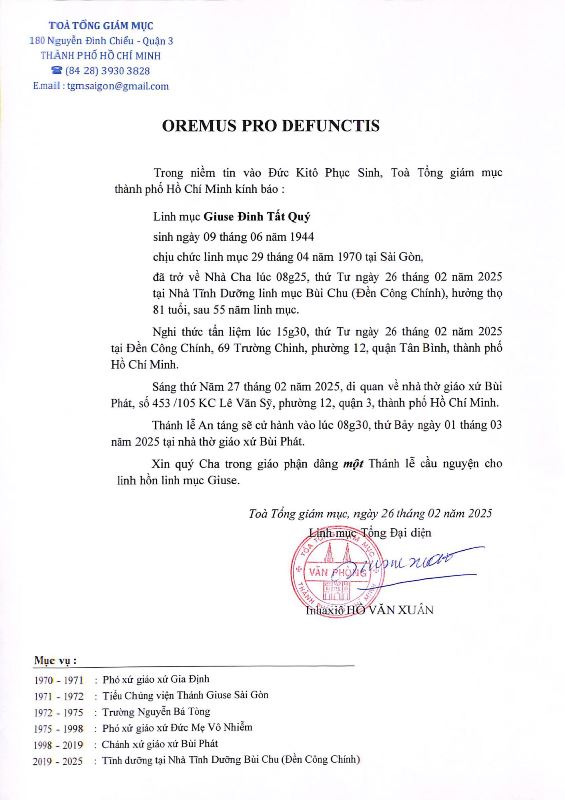Trong tinh thần hiệp thông, Mục Vụ Văn Bút cho đăng lại Cáo Phó của Linh mục Đinh Tất Quý, Thánh Danh Giuse, Chương trình tang lễ và mấy dòng tiểu sử, do Văn Phòng Tổng Đại Diện sắp xếp, để độc giả cùng thông hiệp trong lời nguyện cầu cho linh hồn Cha Giuse được hưởng ơn nghĩa trong Nước Chúa.