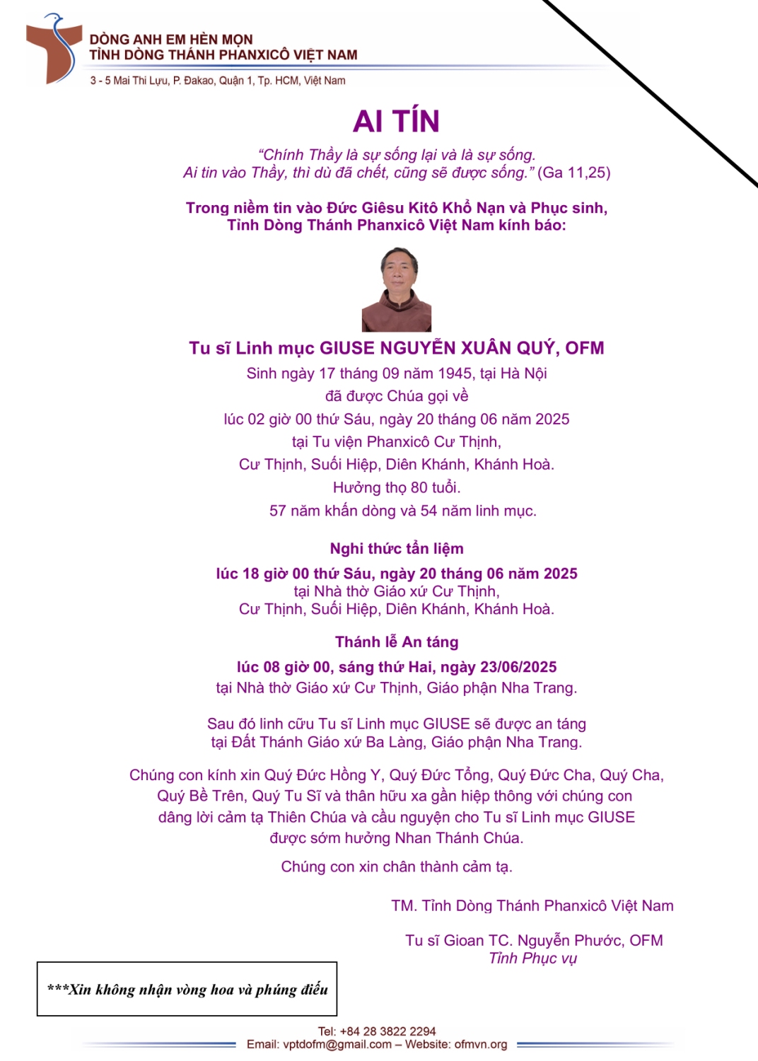 Trong niềm hiệp thông phân ưu và nguyện cầu, Mục Vụ Văn Bút cho đăng lại Ai Tín và chương trìng tang lễ của Cố Linh mục Nguyễn Xuân Quý, OFM, Thánh danh Giuse do Văn Phòng Tỉnh Dòng Phanxicô Việt Nam sắp xếp để độc giả cùng thông hiệp trong lời nguyện cầu cho Linh Hồn Cha Giuse được hưởng ơn nghĩa trong Nước Chúa.