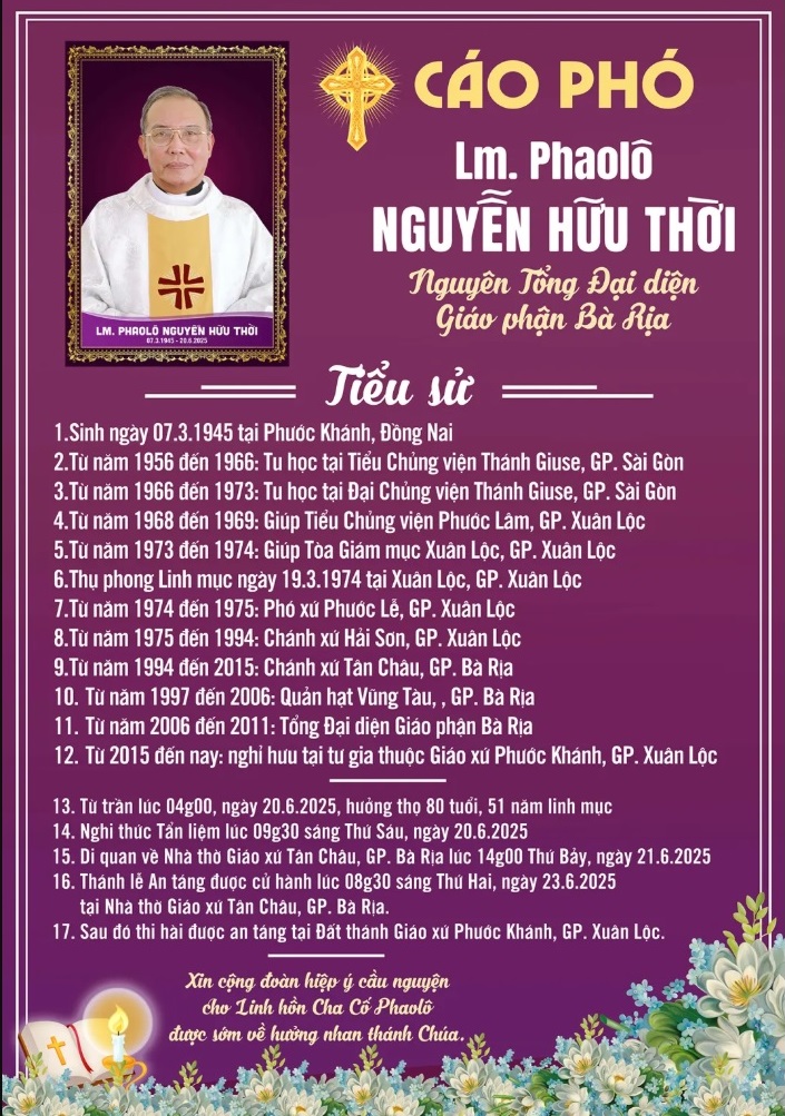 Trong tinh thần hiệp thông, Mục Vụ Văn Bút cho đăng lại Cáo Phó, Chương trình Tang Lễ và mấy dòng tiểu sử của Cố Linh mục Nguyễn Hữu Thời, Thánh Danh Phaolô, do Văn Phòng Toà Giám Mục Ban Mê Thuột sắp xếp, để độc giả cùng thông hiệp trong lời nguyện cầu cho linh hồn Cha Phaolô được hưởng ơn nghĩa trong Nước Chúa.