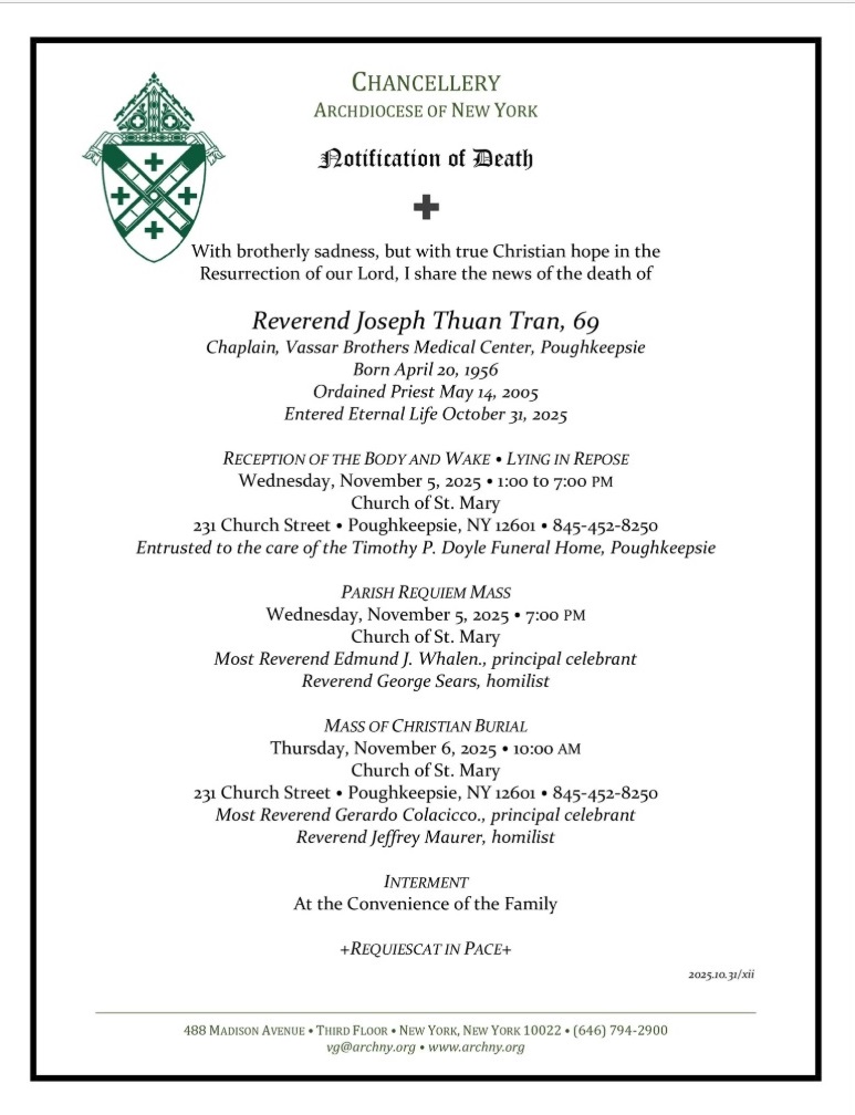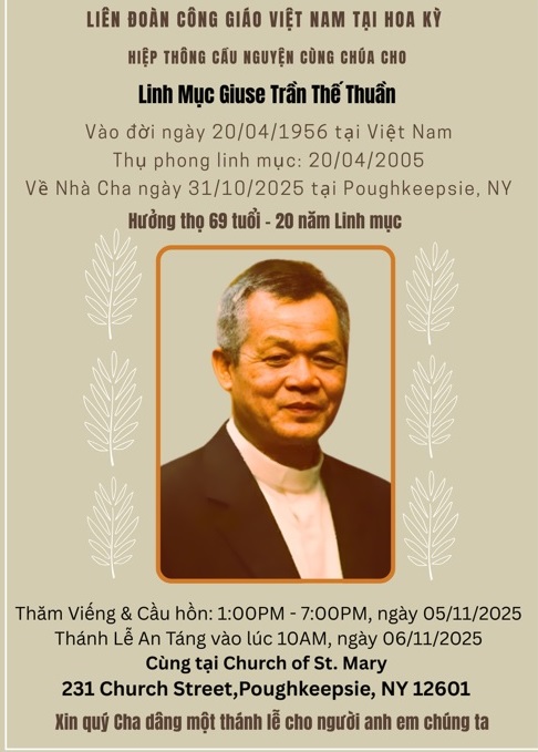 Trong niềm hiệp thông phân ưu và nguyện cầu, Mục Vụ Văn Bút cho đăng lại Ai Tín và chương trìng tang lễ của Cố Linh mục Trần Thế Thuần, Thánh dang Giuse, do Liên Đoàn thông báo và do Giáo Xứ St Mary sắp xếp để độc giả cùng thông hiệp trong lời nguyện cầu cho Linh Hồn Cha Giuse được hưởng ơn nghĩa trong Nước Chúa.