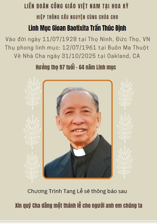 Trong tinh thần hiệp thông, Mục Vụ Văn Bút cho đăng lại Ai Tín và mấy dòng tiểu sử của Cố Linh mục Trần Thúc Định, Thánh Danh Gioa-an Baotixita, do Liên Đoàn thông báo, để độc giả cùng thông hiệp trong lời nguyện cầu cho linh hồn Cha Gio-an Baotixita được hưởng ơn nghĩa trong Nước Chúa.