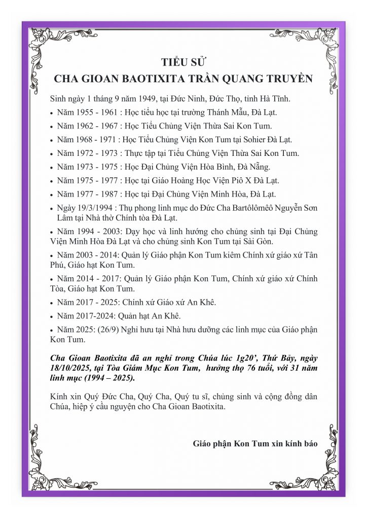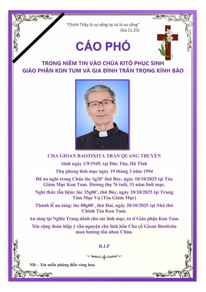 Trong niềm hiệp thông phân ưu và nguyện cầu, Mục Vụ Văn Bút cho đăng lại Tin Cáo Phó, Chương trình Tang Lễ và mấy dòng tiểu sử của Cố Linh mục Trần Quag Truyền, Thánh danh Gioan Baotixita do Văn Phòng Toà Giám Mục Kon Tum sắp xếp, để độc giả cùng thông hiệp trong lời nguyện cầu cho Linh Hồn Cha Gioan Baotixita được hưởng ơn nghĩa trong Nước Chúa.