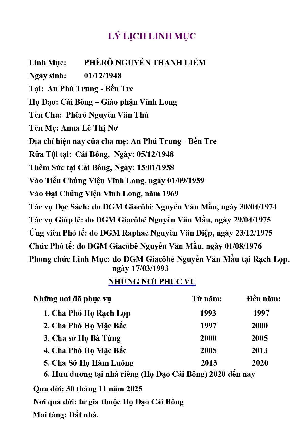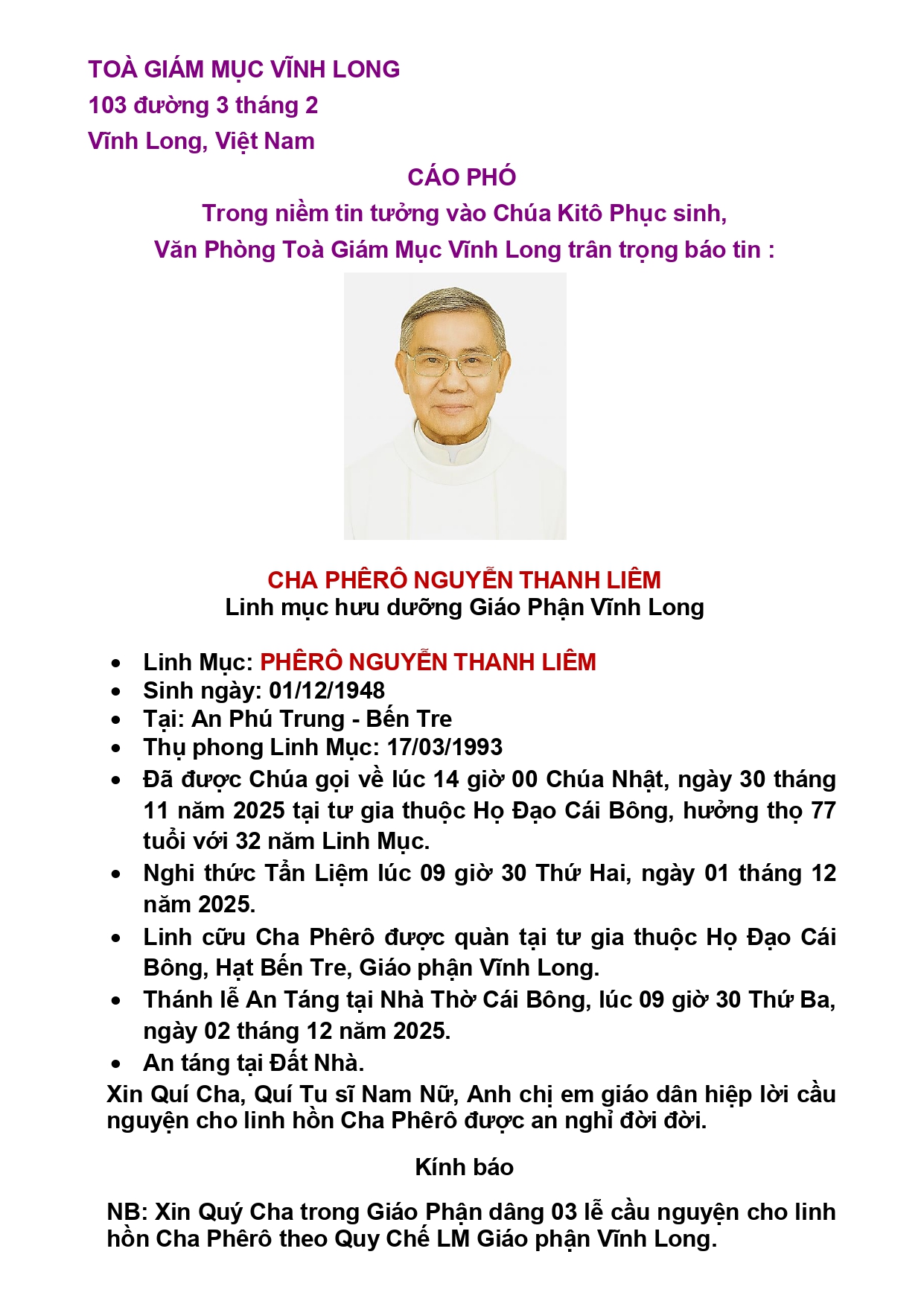 Trong niềm hiệp thông phân ưu và nguyện cầu, Mục Vụ Văn Bút cho đăng lại Cáo Phó, Chương Trình Tang Lễ và mấy dòng Tiểu Sử của Cố Linh mục Nguyễn Thanh Liêm, Thánh danh Phêrô, do Văn Phòng Toàn Giám Mục Vĩnh Long sắp xếp để độc giả cùng thông hiệp trong lời nguyện cầu cho Linh Hồn Cha Phêrô được hưởng ơn nghĩa trong Nước Chúa.