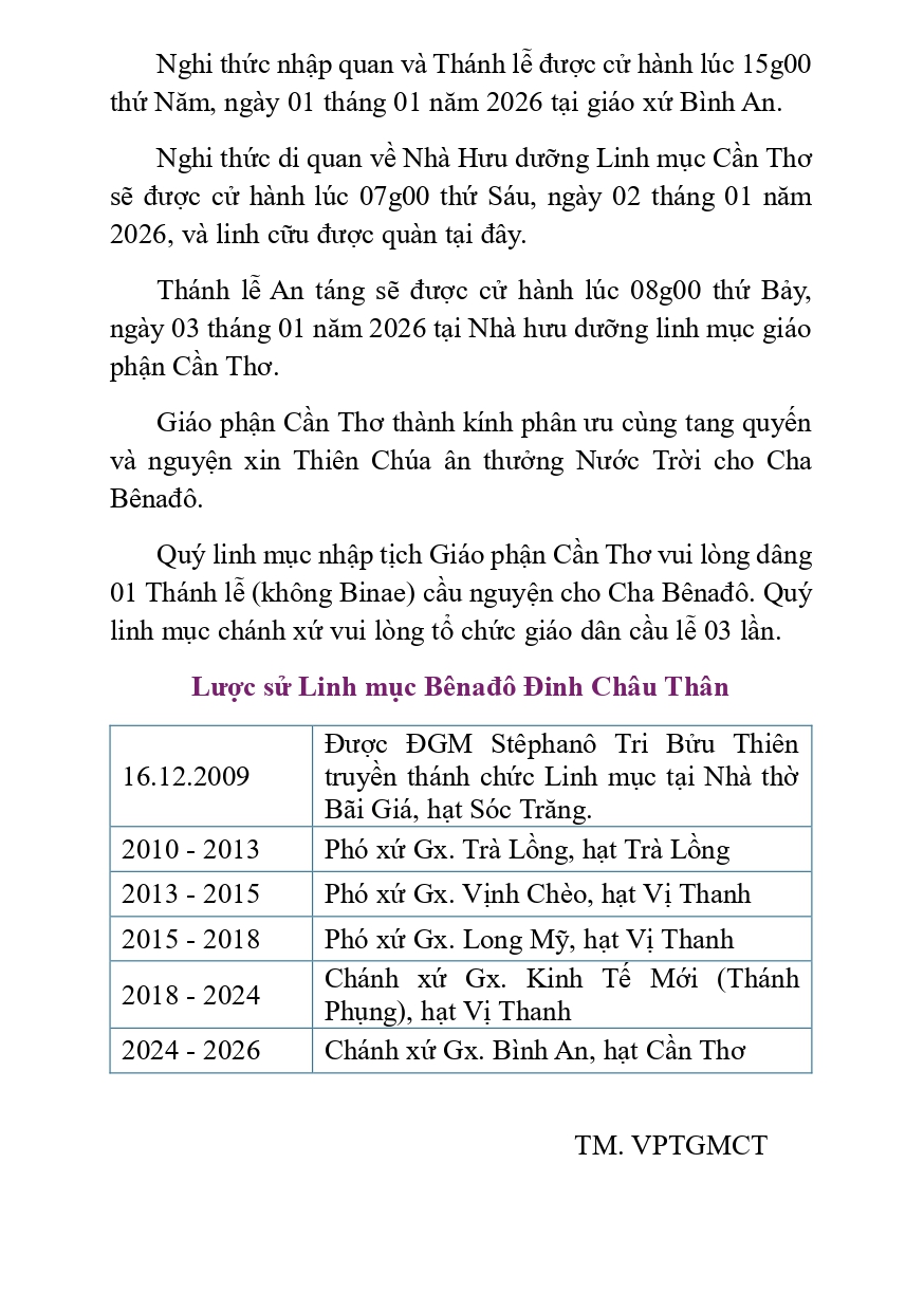 Trong niềm hiệp thông phân ưu và nguyện cầu, Mục Vụ Văn Bút cho đăng lại Cáo Phó, Chương trình Tang Lễ và mấy dòng tiểu sử của Cố Linh mục Đinh Châu Thân, Thánh danh Bênađô do Văn Phòng Toà Tổng Giám Mục Cần Thơ sắp xếp, để độc giả cùng thông hiệp trong lời nguyện cầu cho Linh Hồn Cha Benađô được hưởng ơn nghĩa trong Nước Chúa.