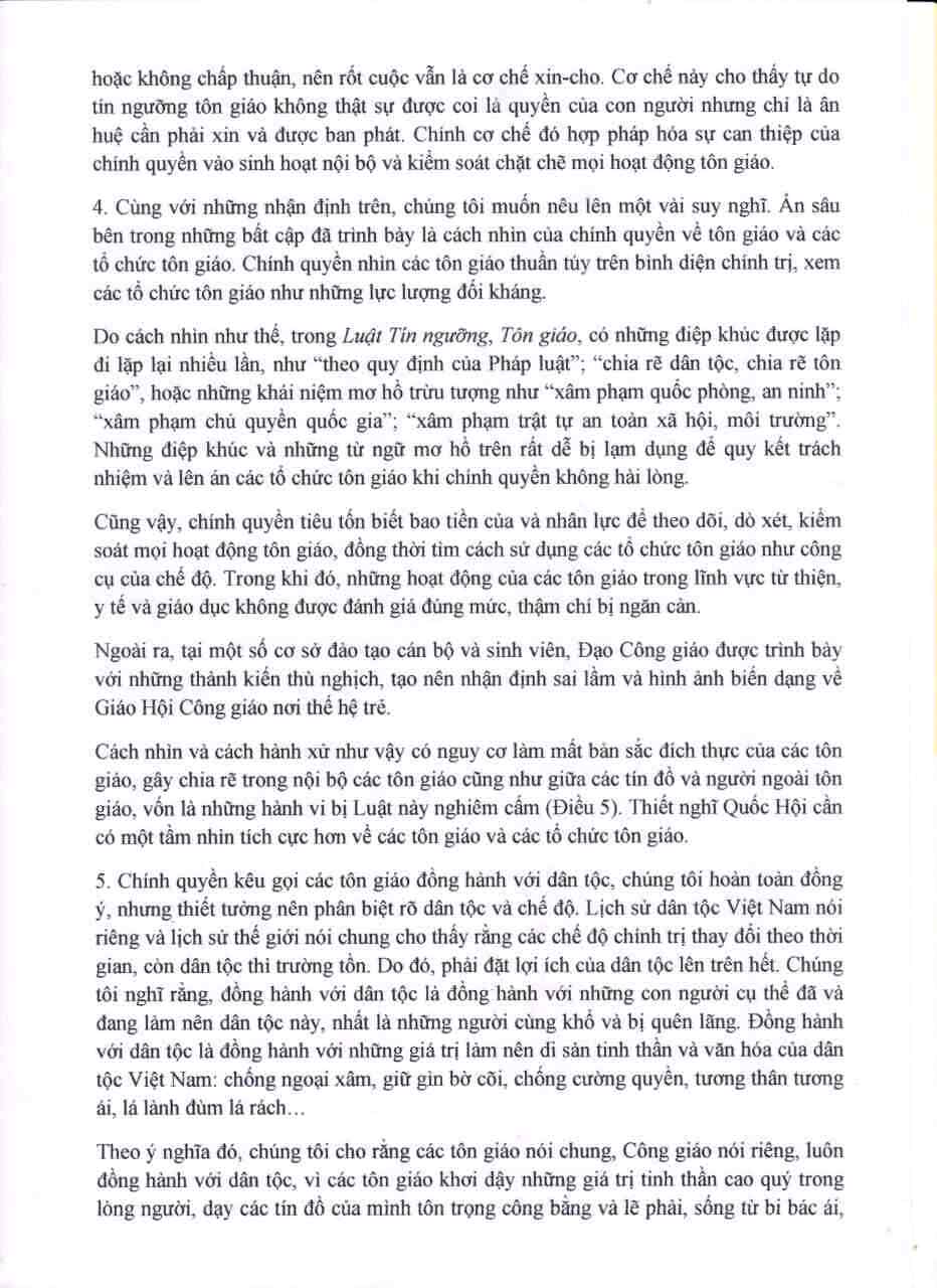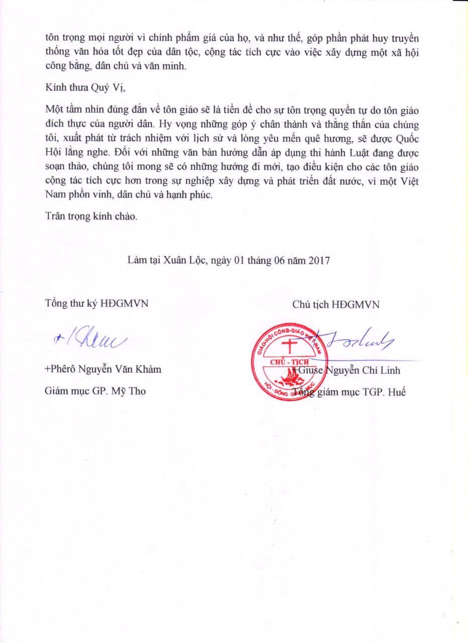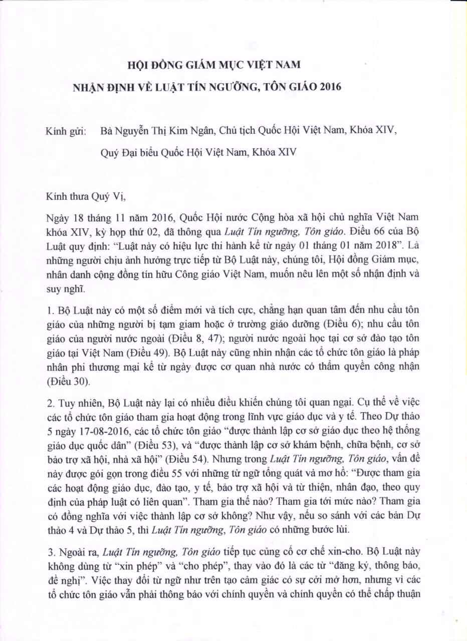 Hội đồng Giám mục Việt Nam đã gửi đến Quốc Hội Việt Nam khoá XIV một số nhận định và suy nghĩ về “Luật Tín ngưỡng, Tôn giáo 2016”.