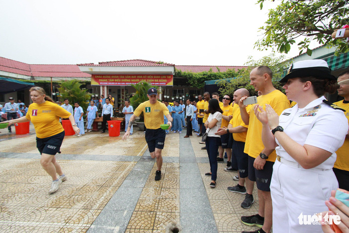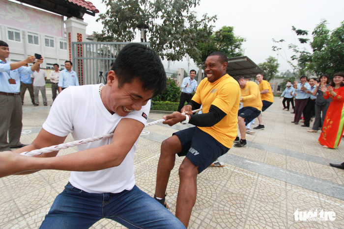 TTO (06/03/2018). - Các thủy thủ Mỹ có chút lúng túng nhưng đầy nhiệt tình tham gia các trò chơi dân gian như thi kéo co, đổ nước vào bình, đập niêu, lột tỏi... với bệnh nhân tại Trung tâm nuôi dưỡng người tâm thần Đà Nẵng.