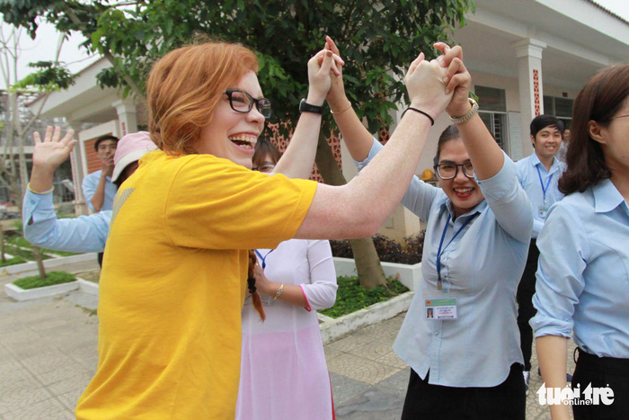 Lính hải quân Mỹ cùng tham gia chơi kéo co với bệnh nhân tâm thần và nhân viên nơi đây - Ảnh: TẤN LỰC