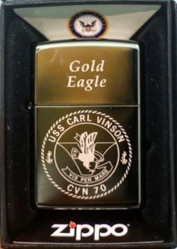 Bật lửa Zippo mang tới Việt Nam in chữ USS Carl Vinson CVN 70 và “Gold Eagle” (Đại bàng Vàng) kèm theo hình ảnh con chim được chọn làm biểu tượng của tàu sân bay này.