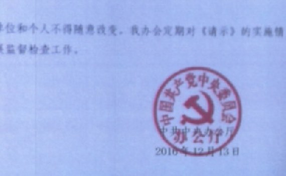 Tài liệu có dấu búa liềm đỏ của Văn phòng Trung Ương Đảng Cộng sản Trung Quốc, còn có tên gọi là Trung Nam Hải, đầu não chính trị của Bắc Kinh.