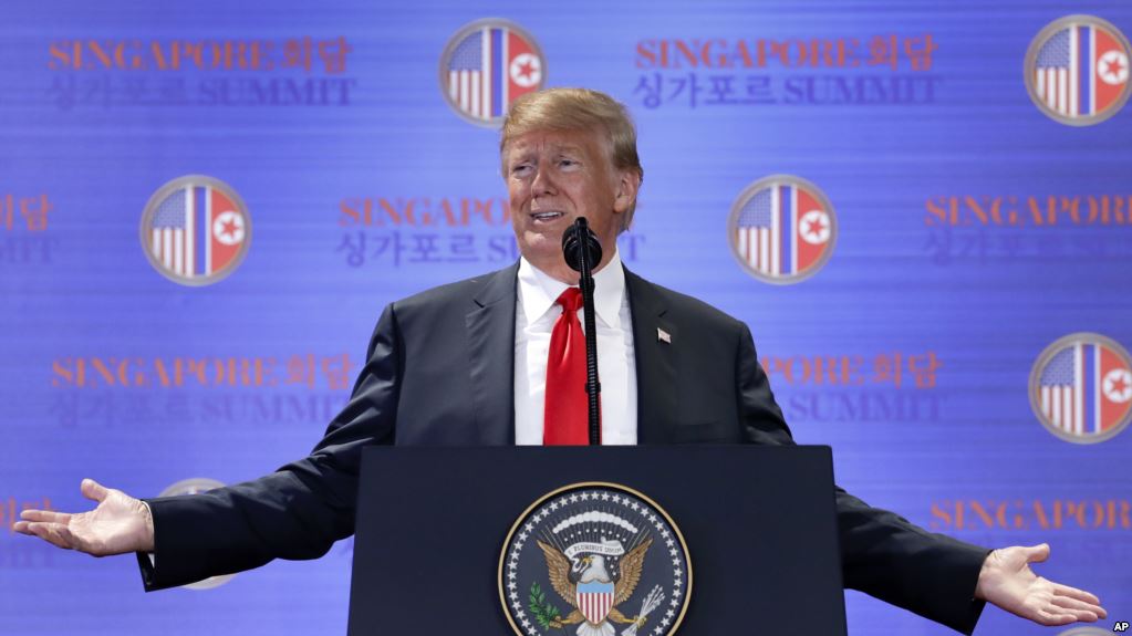 Tổng thống Mỹ Donald Trump tại họp báo sau cuộc gặp thượng đỉnh lịch sử với lãnh tụ Triều Tiên, 12/6/2018