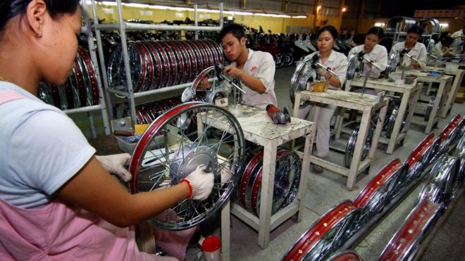 Công nhân tại công ty liên doanh chế tạo xe máy Lifan Việt Nam ở tỉnh Hưng Yên. Xinhua: Bản quyền hình ảnh