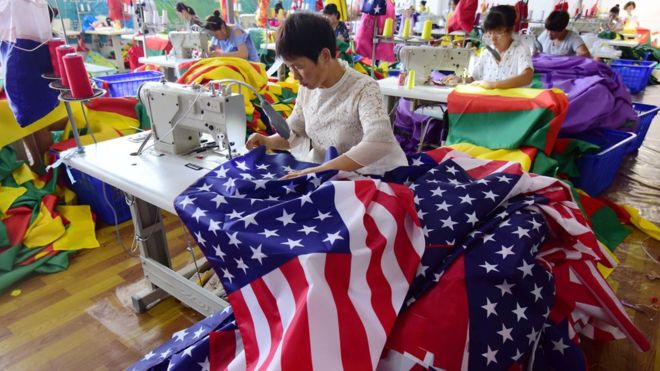 Công nhân Trung Quốc may cờ Mỹ tại một nhà máy gia công ở tỉnh An Huy, TQ. Bản quyền hình ảnh AFP/GETTY IMAGES