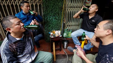 Một nhóm đàn ông Việt uống bia ở Hà Nội. Một dây chuyền sản xuất bia ở Việt Nam.