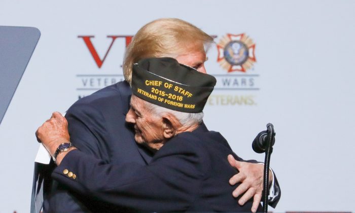 Tổng thống Donald Trump và cựu chiến binh WWII Allen Q. Jones 94 tuổi tại hội nghị Cựu chiến binh nước ngoài thường niên lần thứ 119 tại Kansas City, Mo., vào ngày 24 tháng 7 năm 2018. (Ảnh: Charlotte Cuthbertson / Đại Kỷ Nguyên tiếng Anh)