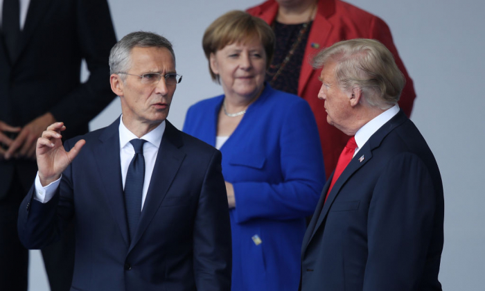 Tổng thư ký NATO Jens Stoltenberg (bên trái), Thủ tướng Đức Angela Merkel và Tổng thống Donald Trump tham dự lễ khai mạc Hội nghị thượng đỉnh NATO 2018 tại trụ sở NATO vào ngày 11 tháng 7 năm 2018 tại Brussels, Bỉ. (Ảnh: Sean Gallup / Getty).