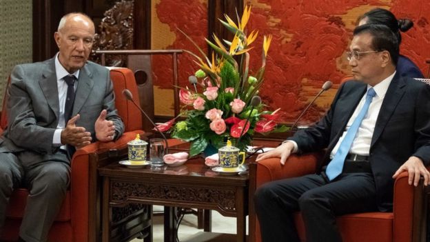 Thủ tướng Trung Quốc Lý Khắc Cường tiếp Tổng giám đốc Tổ chức Sở hữu Trí tuệ Thế giới (WIPO) Francis Gurry trong một sự kiện liên quan đến Sáng kiến Vành đai và Con đường ở Bắc Kinh. Roman Pilipey - Pool/Getty Image. Bản quyền hình ảnh