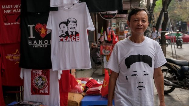 Trên đường phố Hà Nội bắt đầu xuất hiện nhiều chiếc áo thun in hình hai nhà lãnh đạo Mỹ-Triều. Getty Images. Bản quyền hình ảnh