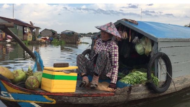 Chèo thuyền đưa chúng tôi đi thăm làng chài trên dòng Tonle Sap, ông Trần Văn Tấn, 45 tuổi, chỉ cho chúng tôi chiếc ghe chở đầy rau củ là nơi bán hàng và sinh sống của vợ chồng ông. "Nhà nổi tôi bán rồi. Mua chiếc ghe này bán hàng và ở luôn. Lên bờ không biết sống bằng gì," ông Tấn nói.