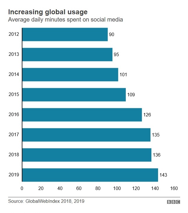 Khảo sát mới cho thấy thời gian dùng mạng xã hội tăng trung bình gần 60% trong bảy năm qua. Công ty GlobalWebIndex có trụ sở tại London phân tích dữ liệu từ 45 thị trường internet lớn nhất thế giới và ước tính thời gian mỗi người dành cho các trang hoặc ứng dụng mạng xã hội tăng từ khoảng 90 phút mỗi ngày năm 2012 lên 143 phút trong ba tháng đầu năm 2019.