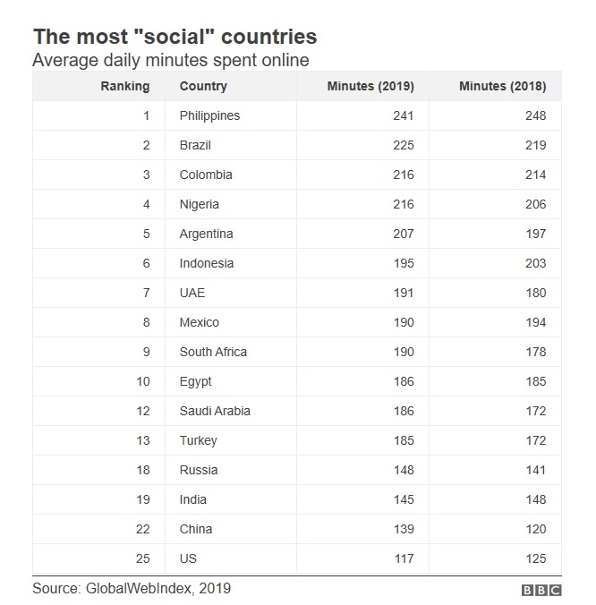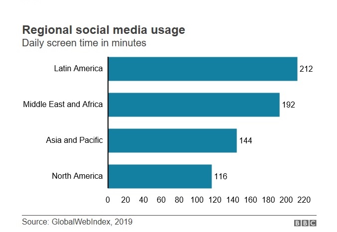 Có sự thay đổi lớn về việc sử dụng ở mức độ khu vực và quốc gia: Mỹ Latinh, nơi có số người sử dụng mạng xã hội lớn nhất, thời gian truy cập hàng ngày trung bình 212 phút.
