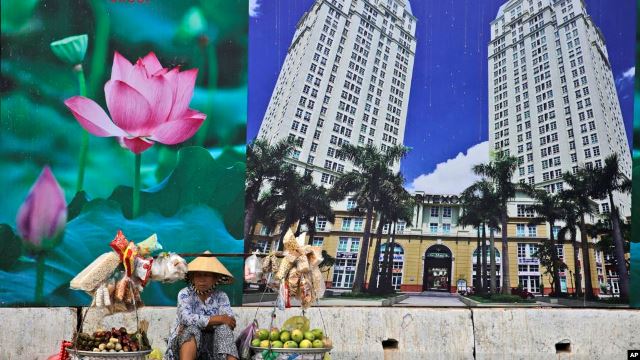 Một người bán hàng rong chờ khách gần một biển quảng cáo của một khu mua sắm và chung cư ở TP HCM. Việt Nam, sau khi thành công trong dập tắt dịch COVID-19 giờ đây đối diện với việc phục hồi kinh tế.