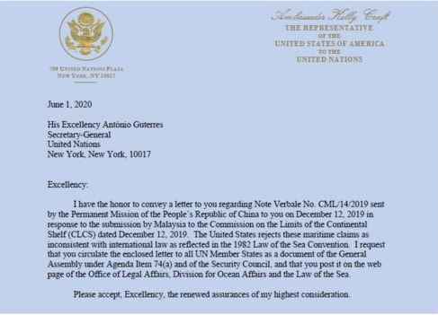 "Tôi rất vinh dự được gửi tới ngài một bức thư liên quan tới Công hàm số CML / 14/2019 do Phái bộ thường trực của Cộng hòa Nhân dân Trung Hoa gửi cho ngài vào ngày 12/12/2019 để phản hồi đệ trình của Malaysia lên Ủy ban về Ranh giới thềm lục địa (CLCS) ngày 12/12/2019. Hoa Kỳ bác bỏ các yêu sách hàng hải này vì nó không phù hợp với luật pháp quốc tế như được phản ánh trong Công ước Luật biển 1982."