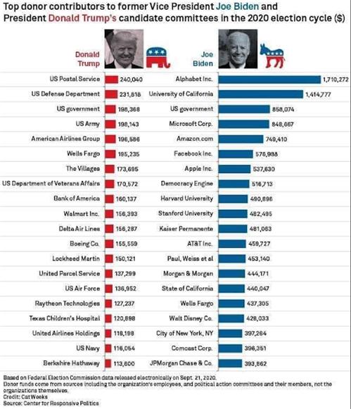 Trong khi đó, top tài trợ cho Trump đến từ Quân đội Mỹ, dịch vụ bưu điện, các hãng hàng không và từ tầng lớp lao động nói chung. Vì vậy, đối đầu với ông Trump thật ra không phải là ông Biden đầu óc đãng trí, mà là cả một thế lực khổng lồ đằng sau.