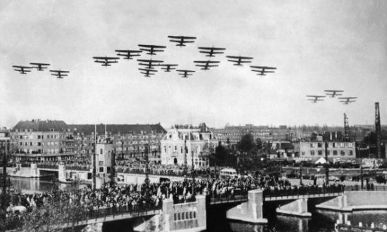 Ảnh chụp trong Thế chiến thứ II về máy bay bay trên một thành phố của Hà Lan. (Ảnh: AFP qua Getty Images)