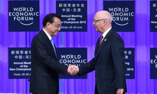 Người sáng lập và chủ tịch điều hành của WEF Klaus Schwab bắt tay với Thủ tướng Trung Quốc Lý Khắc Cường trong Diễn đàn Kinh tế Thế giới vào ngày 27 tháng 6 năm 2016 tại Thiên Tân, Trung Quốc. Cuộc họp hàng năm của Diễn đàn Kinh tế Thế giới quy tụ các nhà lãnh đạo kinh doanh, kinh tế và chính trị và các cựu quan chức. (Ảnh của Wang Zhao - Pool / Getty Images)