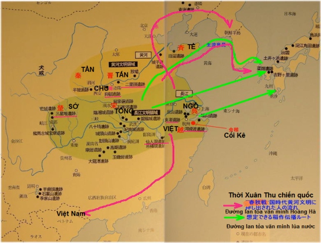 Các nhà khoa học Nhật, Mỹ, đã có nhiều phát hiện, chứng minh nền văn minh Ngô Việt sau khi nước Việt bị diệt và Trung Hoa hóa (đúng hơn là Sở hóa), đã theo dòng người Ngô Việt chạy ra biển sang Nhật Bản (tiếng Nhật Bản đọc Hán tự theo kiểu nước Ngô, nên gọi là ごおん-Go On- Ngô âm 呉音). Nền văn minh đó chủ yếu theo bộ phận tinh hoa của dân Ngô Việt chạy xuống phía Nam hợp lưu cùng Việt bản địa, thành ra văn minh Việt kéo từ Lĩnh Nam (phía Nam dãy Ngũ Lĩnh - tức Bắc Lưỡng Quảng ngày nay) đến Giao Chỉ. Theo phát hiện của Jerry Norman và Tsu-lin Mei (Washington University và Cornell University) thì nhiều từ cổ của tộc Việt nước Ngô Việt hiện vẫn thông dụng trong tiếng Việt ngày nay, ví dụ các từ: chết; chó, đồng (trong đồng cốt), sông, khái (hổ), ngà (trong ngà voi), con (trong con cái), ruồi, đằm (trong đằm ướt), sam (con sam), biết; bọt , bèo…8 Điều này chứng tỏ rằng dân Lạc Việt ít nhiều có cùng huyết thống với dân Ngô Việt xưa.