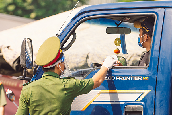 Lực lượng chức năng kiểm tra các phương tiện ra vào quận Gò Vấp đang thực hiện giãn cách xã hội theo Chỉ thị 16. (Ảnh: Bạch Cúc)