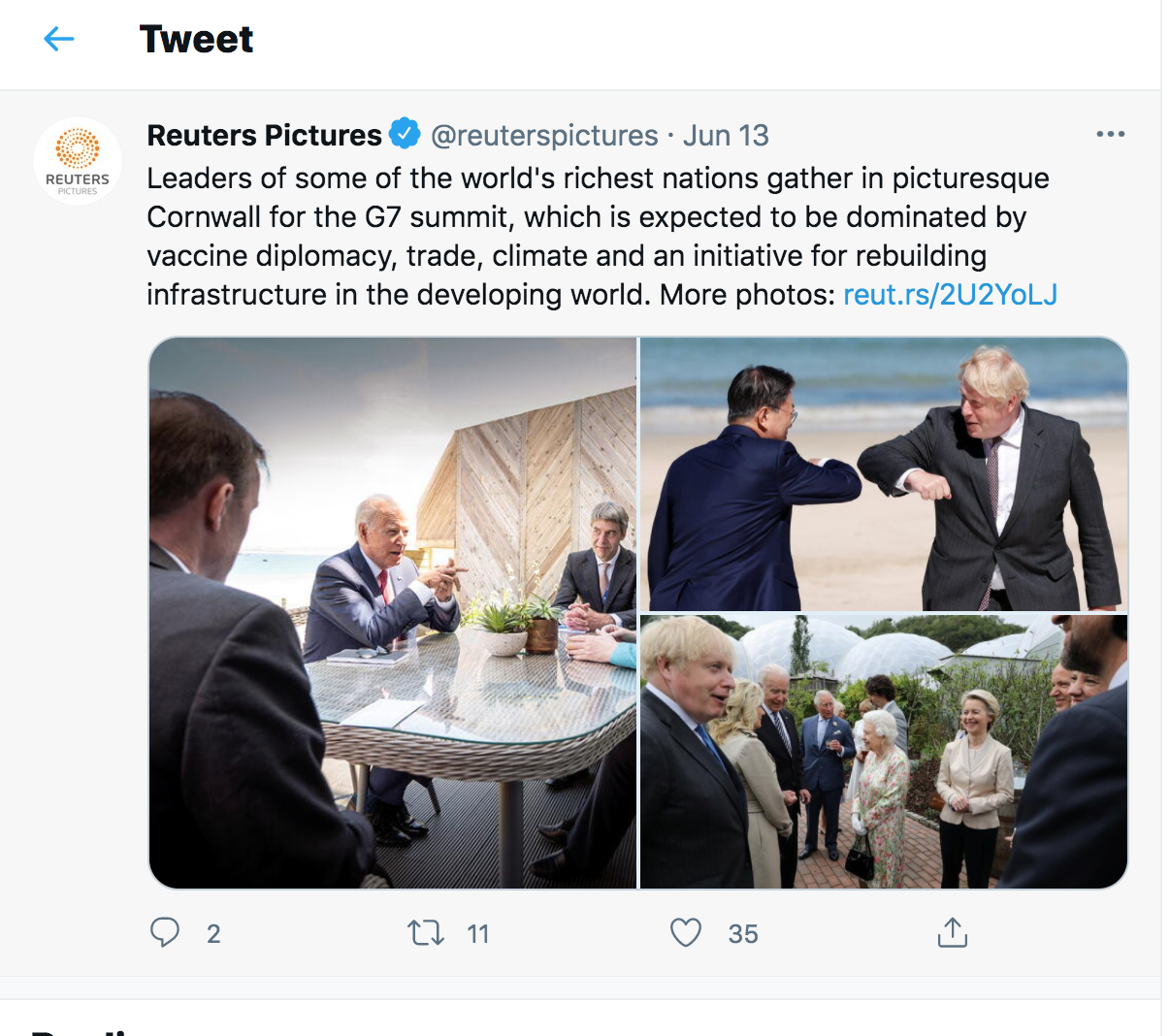 Các nhà lãnh đạo G-7 nhóm họp tại Cornwall (Anh). Ảnh chụp qua Twitter.