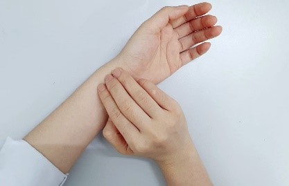 Đếm mạch: Vị trí đặt ba ngón tay như hình, bạn sẽ thấy mạch đập dưới tay mình.