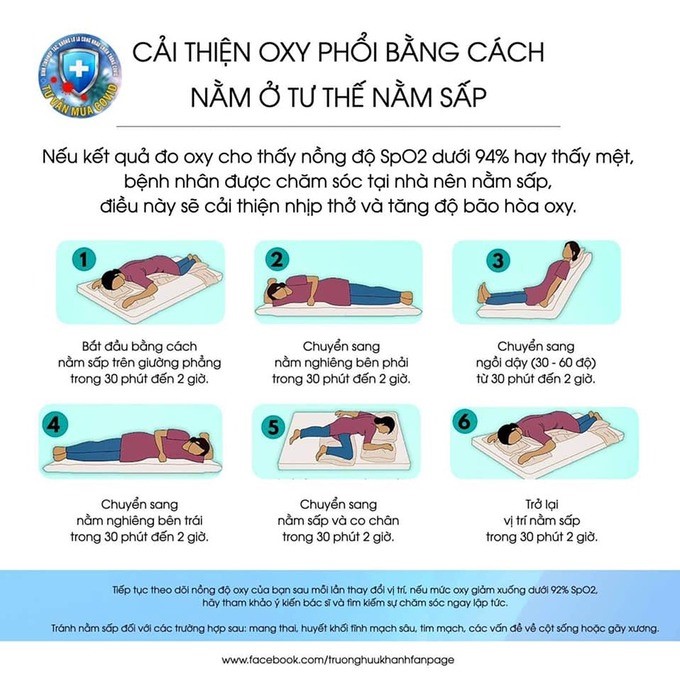 Theo BS Trương Hữu Khanh, các bệnh nhân khó thở liên quan đến COVID-19 thì việc nằm sấp rất hữu ích, sẽ vận dụng được tất cả phần phổi ở ở phía dưới. Nằm nghiêng bên phải 30 phút, rồi nằm nghiêng bên trái 30 phút để tất cả phổi hoạt động.