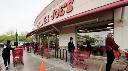 Khách hàng tôn trọng giản cách xã hội bên ngoài siêu thị Trade Joe tại Omaha, Nebraska.