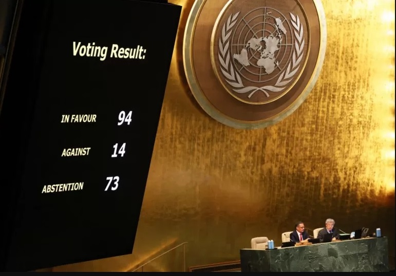 Nghị quyết lần này, lần thứ tư về Nga xâm lăng Ukraine, không có tính ràng buộc về mặt pháp lý, đã được thông qua với 94 phiếu thuận, 73 phiếu trắng và 13 phiếu chống.